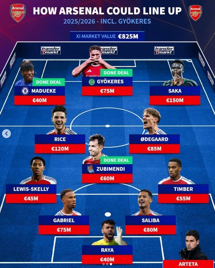 德转预测阿森纳主力阵:马杜埃凯、约克雷斯、祖比门迪在列